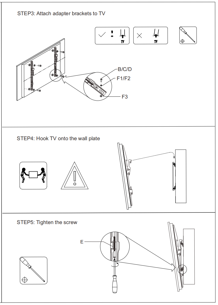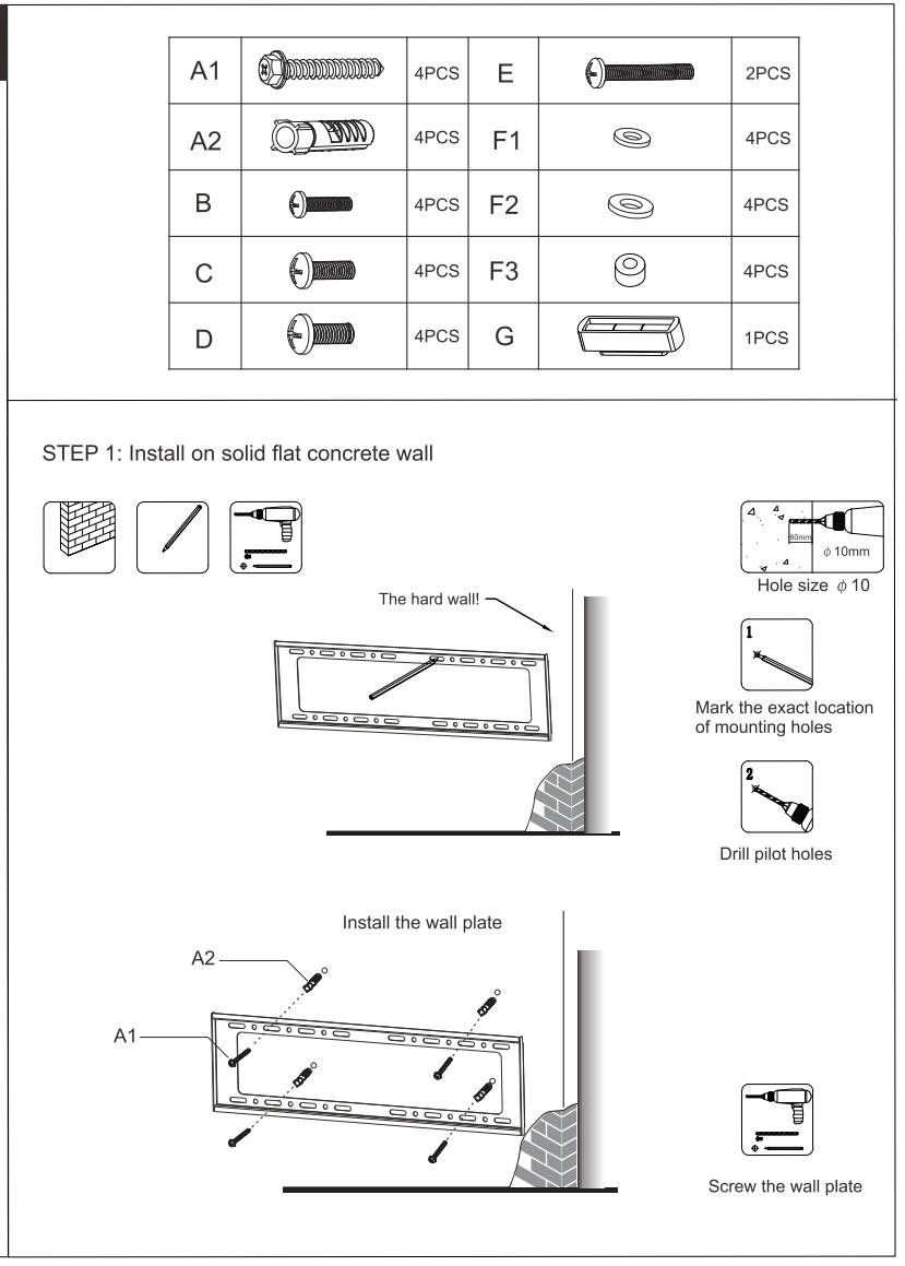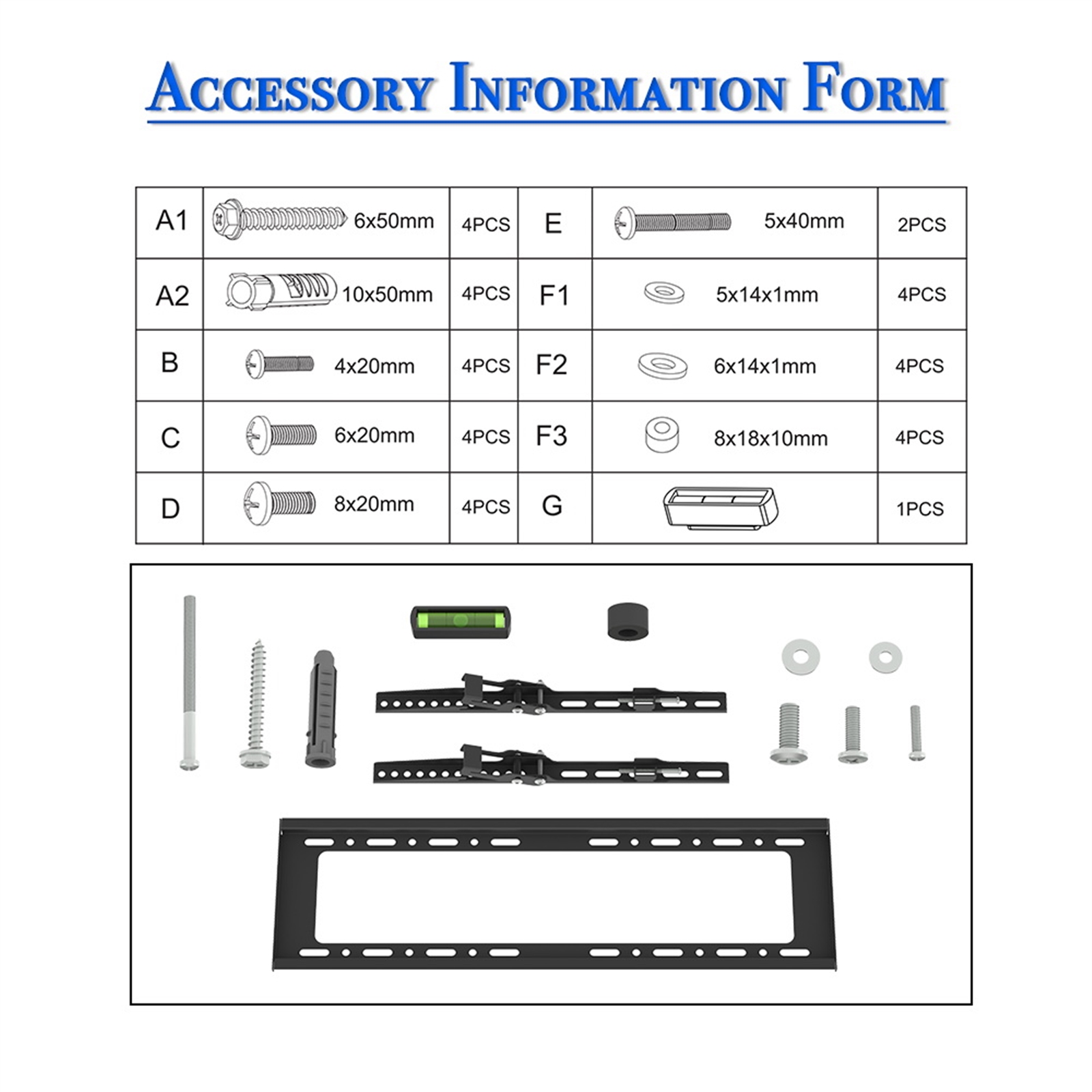1x Standard hardware kit (The Screw kit is standard. Don’t make sure fit all the TV models. Please buy one kit if don’t fit)